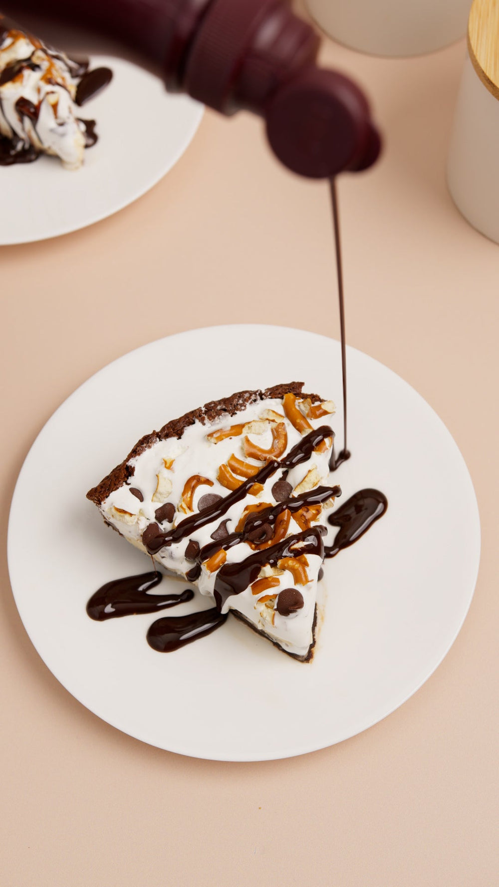 Melt some chocolate chips and warm up chocolate syrup Drizzle both over the top of the pie. Cover and freeze for 2 hours.